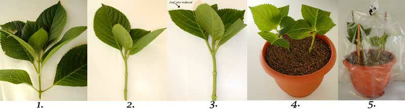 Reznice se tada jednostavno zabodu u zemlju i pokriju staklenkom ili odrezanom plastičnom bocom kako bi se ispod stvorio efekt staklenika. Ja sam im dala i dodatnu pomoć u vidu biljnog hormona za ukorjenjivanje. To je prah koji se kupuje u agrarijama i biljnim apotekama i pomaže biljci da lakše i brže pusti korijen. Čula sam za dvije varijante korištenja – jedna je da se donji dio reznice umoči u vodu i potom u prah, prije pikiranja u zemlju. Druga je da se biljka zabode u zemlju, a onda se oko nje pospe prah. Ja sam primijenila ovu drugu varijantu i pokazala se uspješnom. Ova fotografija ispod, sa stranice plantaddicts.com, jako lijepo pokazuje kako se hortenzija razmnožava reznicama.