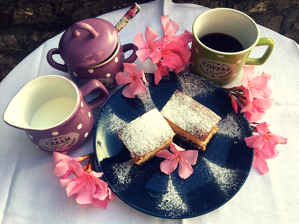 Pećnicu zagrijte na 200 stupnjeva, stavite da se peče i kada porumeni smanjite na 180 stupnjeva. Peče se oko 45 minuta. Gotov kolač, dok je još vruć, poprskajte s malo hladne vode, pokrijte i pustite da se ohladi. Režite na kocke i pospite šećerom u prahu.