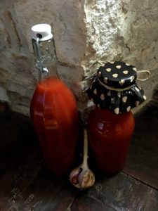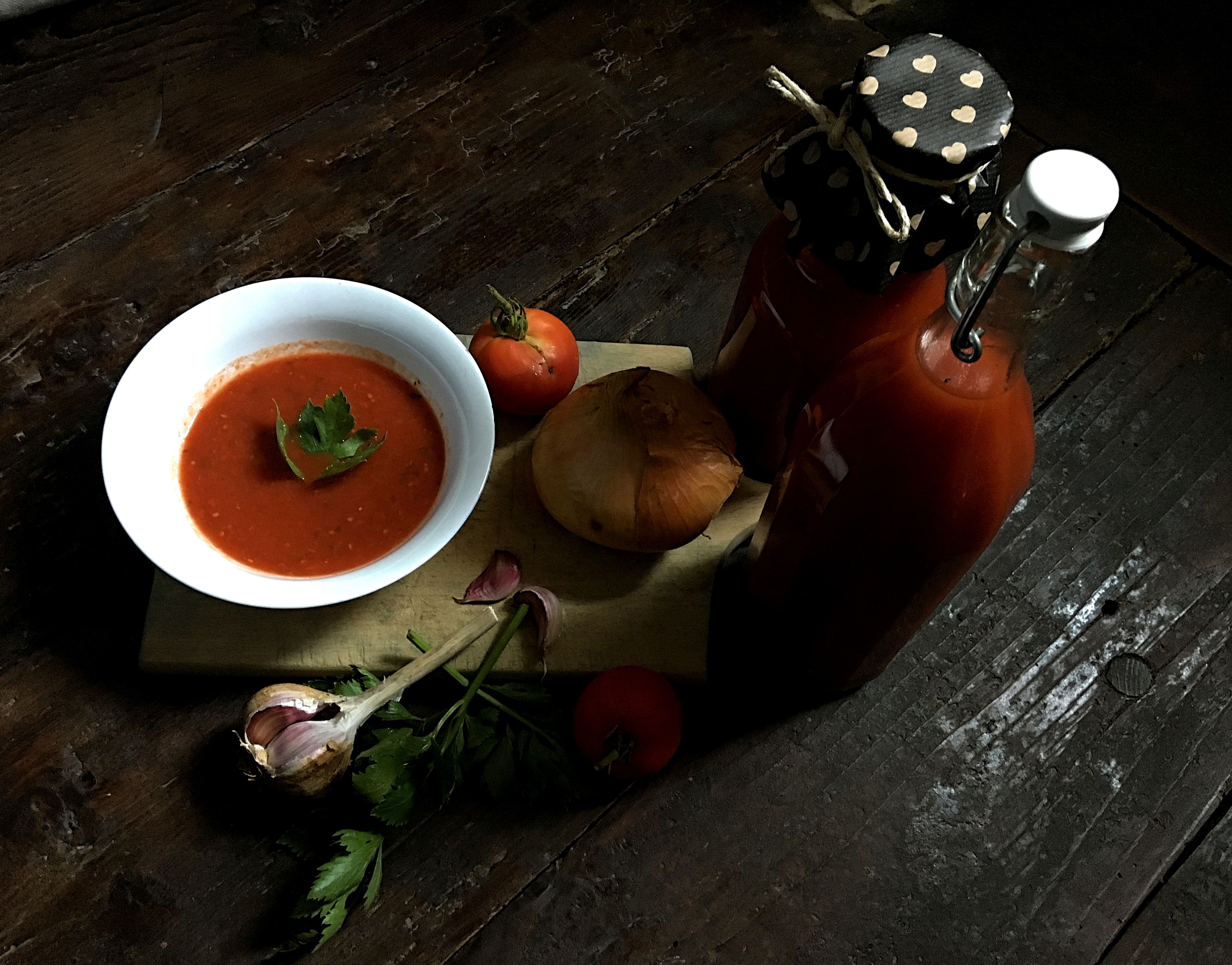 Sljedeće što smo radile je cijeđenje tekućine, odnosno, juhe, koju možete odmah grijati i jesti, ili spremiti u platične boce i zamrznuti. Iznenadilo me kada sam čula da neki ovu juhu bacaju, jer to bi doista bio grijeh. Jednostavno, kroz obično cjedilo za tjesteninu procijedite u zasebnu posudu tekućinu iz smjese koju ste dobili kuhanjem. Procijeđeni dio bez tekućine iz cjedila stavljajte u drugu zasebnu posudu (od toga ćete na kraju imati šalšu), a tekućinu, kao što rekoh, spremajte u boce. Imat ćete tako predivnu, gustu juhu od rajčice, već aromatiziranu, u koju možete samo, po želji, ukuhati malo riže i dodati još začina. Od ove količine rajčice dobila sam skoro šest litara juhe. S obzirom da se kod nas juha jede u velikim količinama, dio je nestao odmah, a ostatak sam stavila u staklene boce i spremila u frižider. Pojest će se u sljedećih nekoliko dana.