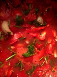 Treba, dakle, imati posudu za kuhanje dovoljno veliku da odgovara onoj količini povrća s kojom radite. Rajčicu operite i narežite direktno u posudu. Mi smo radile s otprilike petnaestak kila rajčice, pa smo na tu količinu u posudu dodale još narezan debeli stručak svježeg peršina (ne morate ga rezati presitno, ionako se sve kuha), pet većih glavica luka (narezano na četvrtine), dvije glave češnjaka (u šalšu idu cijeli režnjevi), stručak celera, stručak bosiljka i pola šake soli.