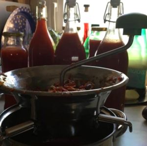 I na kraju, pasiranje. To smo radile s ručnom pasirkom od inoksa (ako se pitate kako izgleda pogledajte sliku ispod). U nju se stavlja dio po dio iscijeđene rajčice i ručica se vrti dok ispod u posudu curi čista, sočna šalša. Kožice i ostaci povrća ostaju gore i bacaju se. Ispasirana, mirisna šalša na kraju se stavlja u plastične vrećice (količinu za jednu vrećicu određujete sami, prema svojim potrebama) i u duboko zamrzavanje.